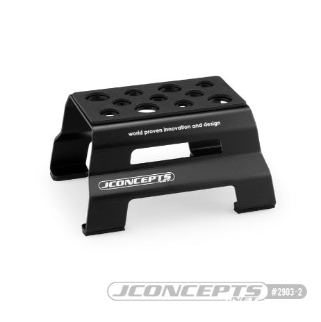 The JConcepts aluminum car stand is perfect for the 1/8th or 1/10th racer looking to add a little sturdiness to their racing program. The all-aluminum formed and cut piece stands tall and keeps the wheels off the ground for an array of vehicles.