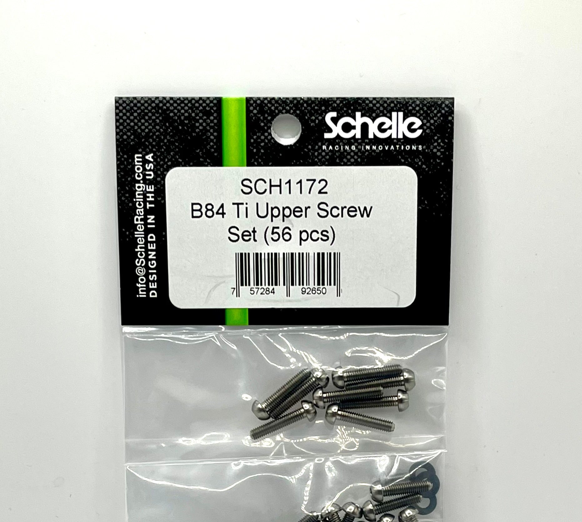 The Schelle B84 upper set of 56 screws strategically removes kit steel screws from up high above the chassis, which lowers the CG and improves handling. All chassis bottom screws are not included in this set.